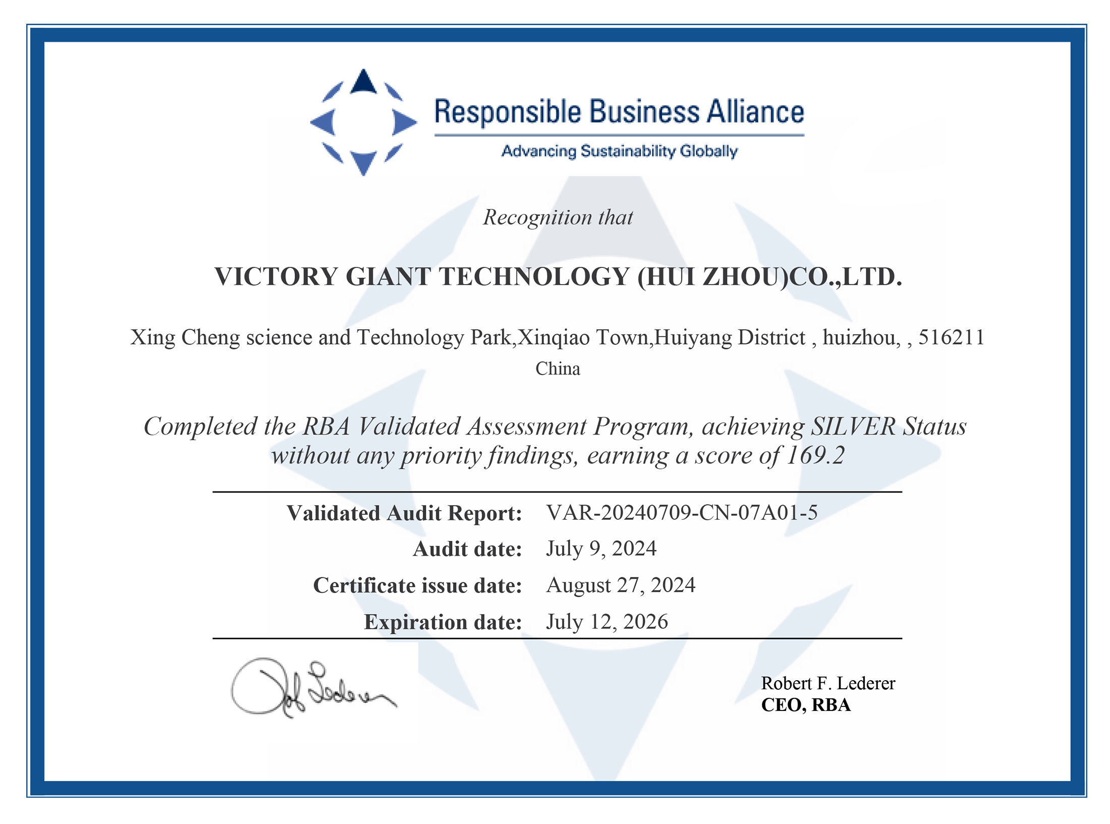 RBA VAP 社會責任審核證書